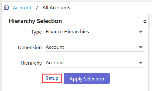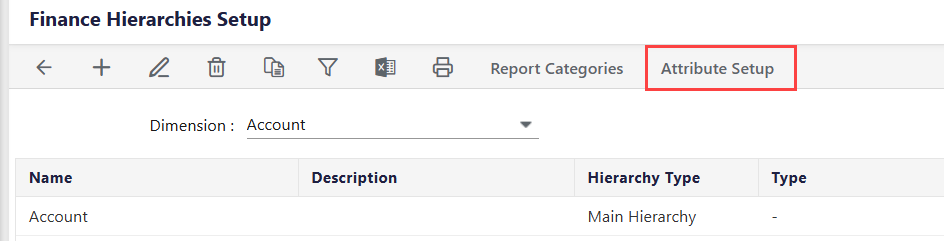 On the Finance Hierarchies Setup page, click Attribute Setup. The Finance Attributes page appears.
