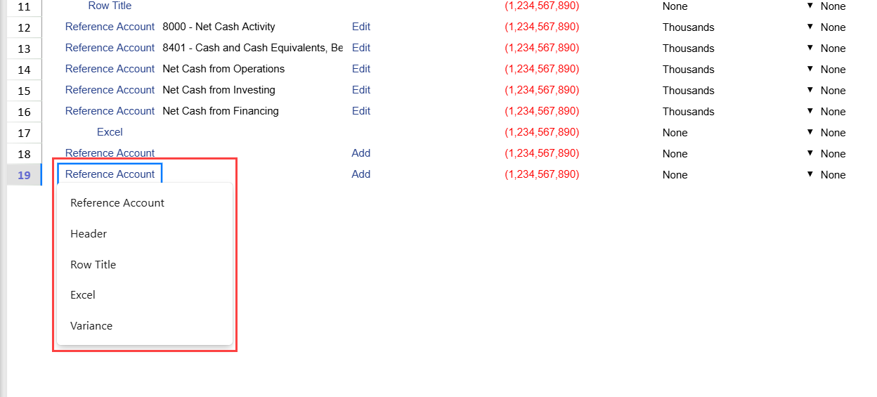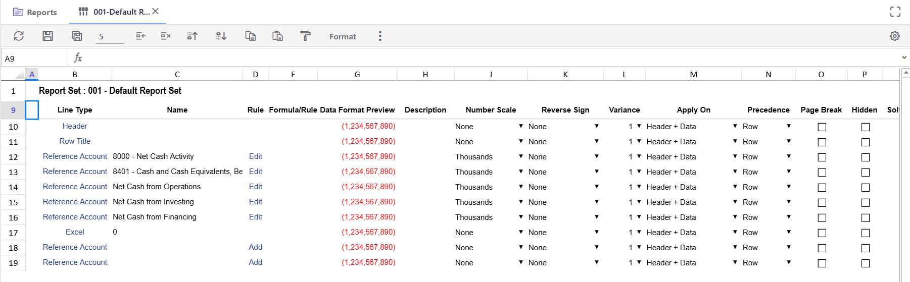 A Static Report is created by defining each line item within the Report Set. Static Report Sets typically include header lines, Excel lines, reference account lines, and row title lines.