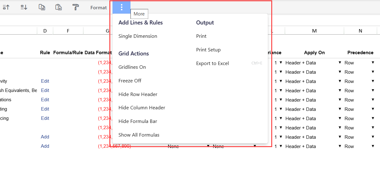 Click the More icon to add lines and rules and perform grid actions. The below mentioned options are available.