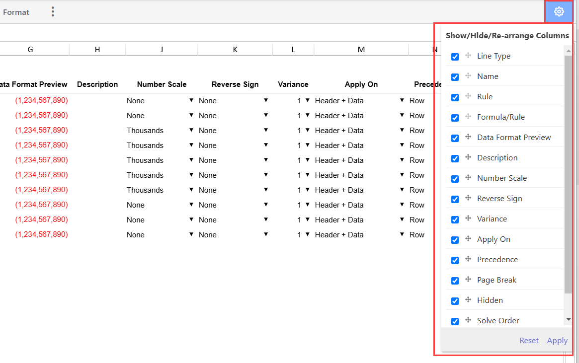 Click the settings icon to open the Show/Hide/Re-arrange Columns pane. These settings allow you to show, hide, and rearrange the columns according to specific requirements. A column can be dragged and dropped to reorder in the Show/Hide/Re-arrange Columns drop-down list. The column settings are retained when the Report Set is accessed again and when exporting a Report Set to Excel.