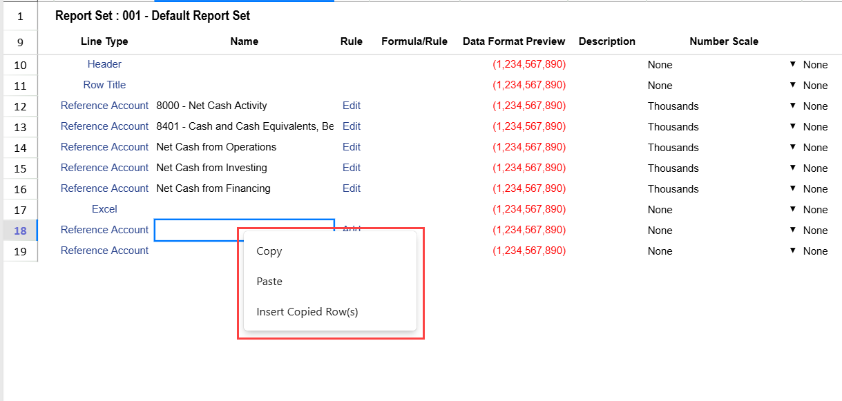 The format can be copied and pasted to all cells, Report Set lines, including row and column headers, merged lines, and Excel formulas. Data formatting can also be copied and pasted to a Report Set line only. The format is retained when saving, running, refreshing, using Save As, copying, or exporting a Report Set.