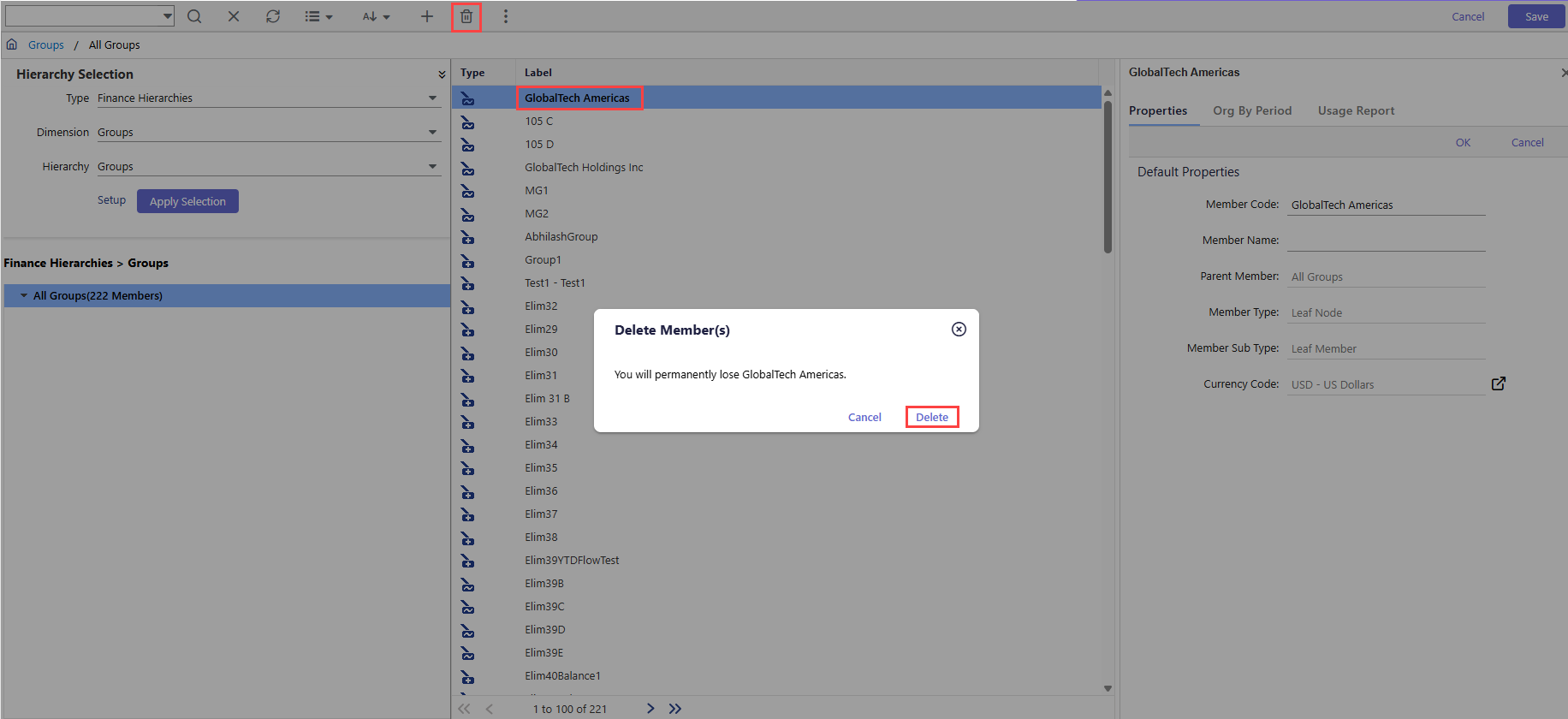 You can delete groups from the Group dimension from the Hierarchy Management page.