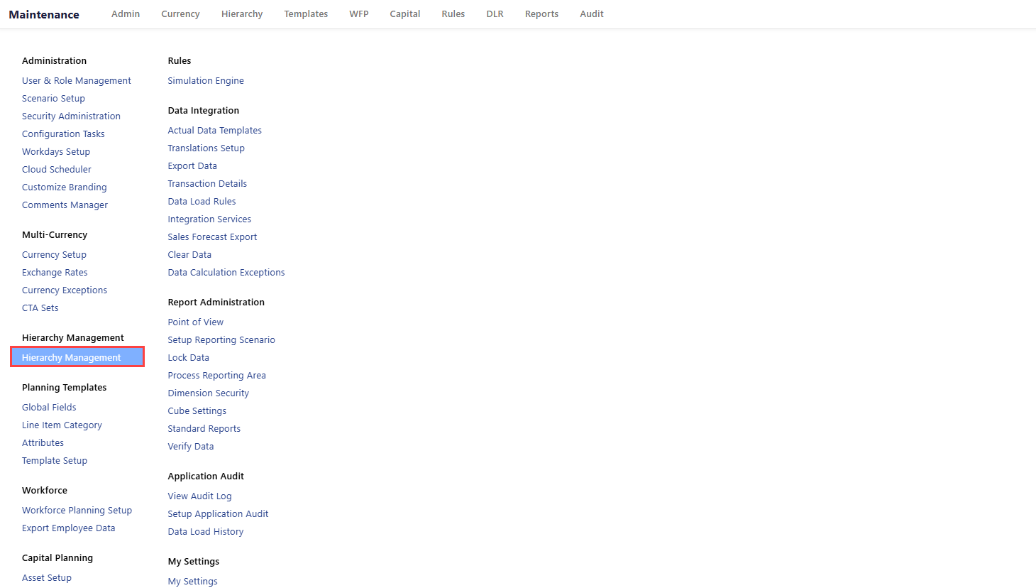 Navigate to Maintenance > Hierarchy Management.