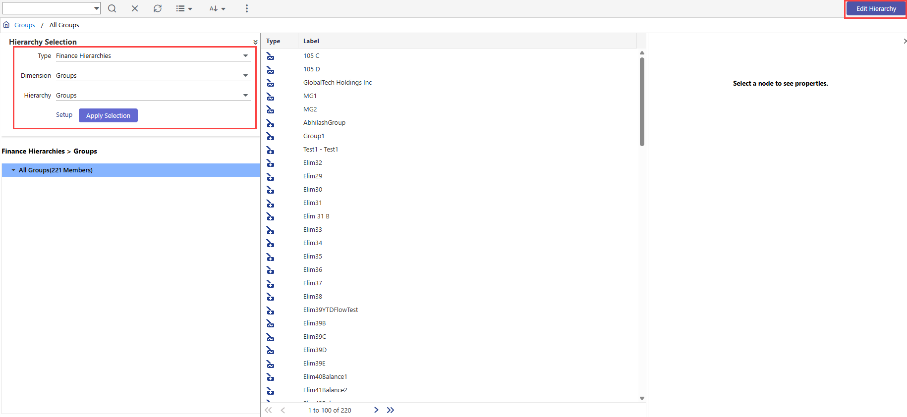 Select Type, Dimension, Hierarchy as Finance Hierarchies, Groups, and Groups respectively, and then click Apply Selection.