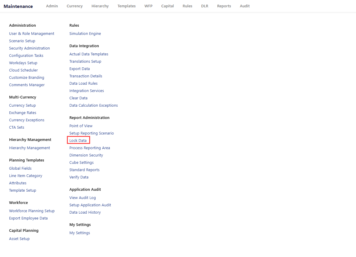 Navigate to Maintenance > Report Administration > Lock Data.