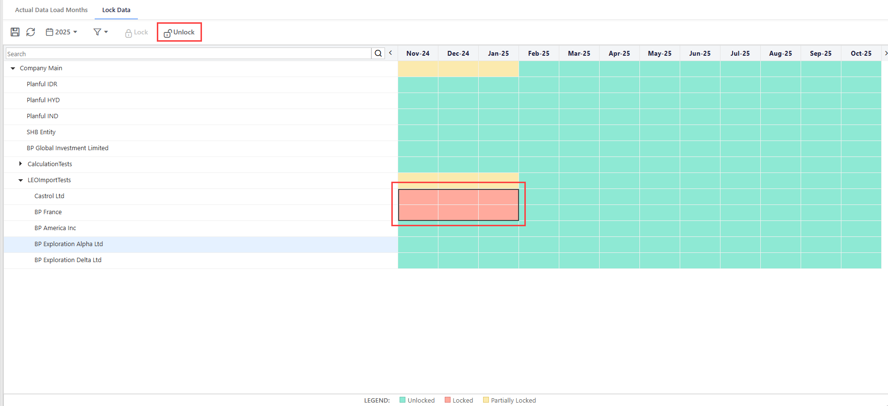To unlock a period or periods for an entity, select the cells and click the Unlock icon.