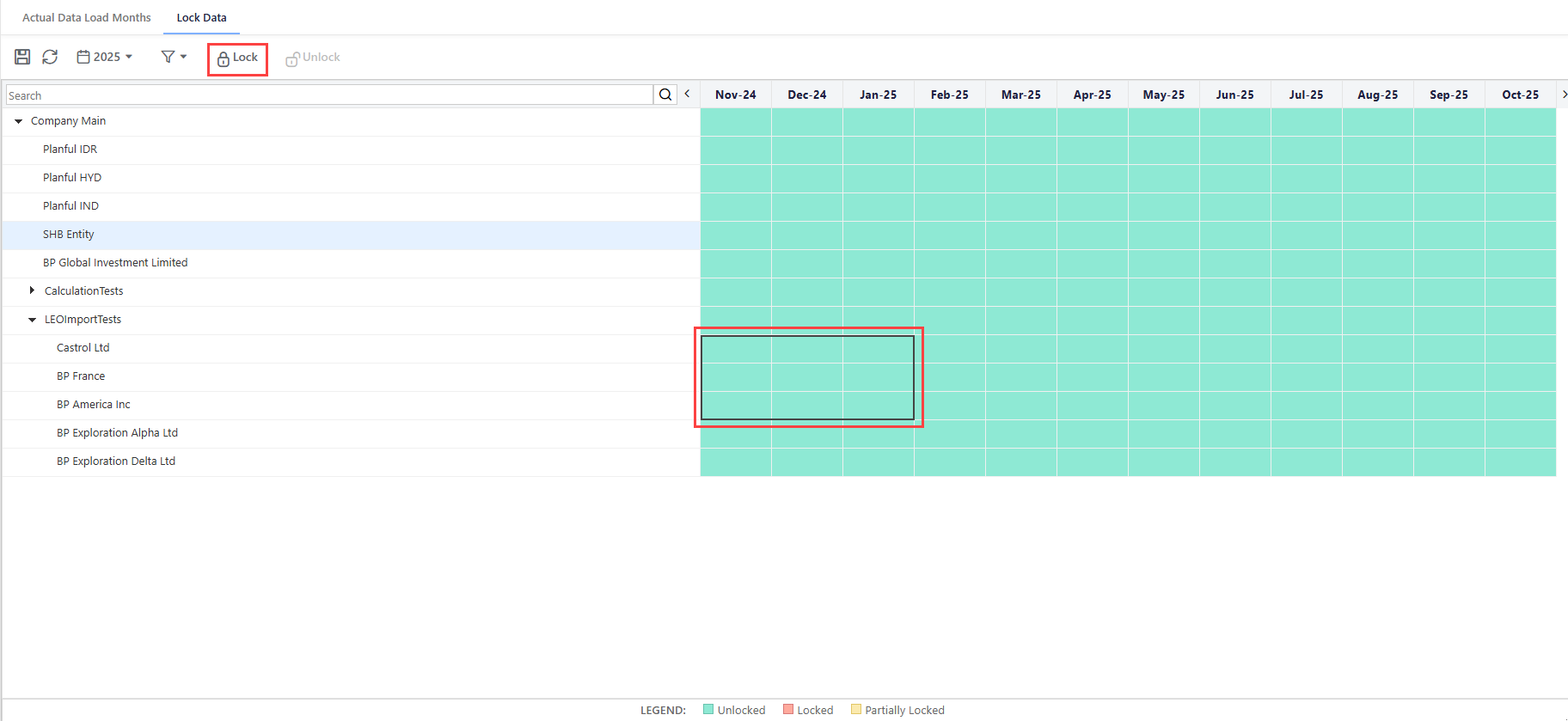 To lock a period or periods for an entity, select the cells and click the Lock icon.